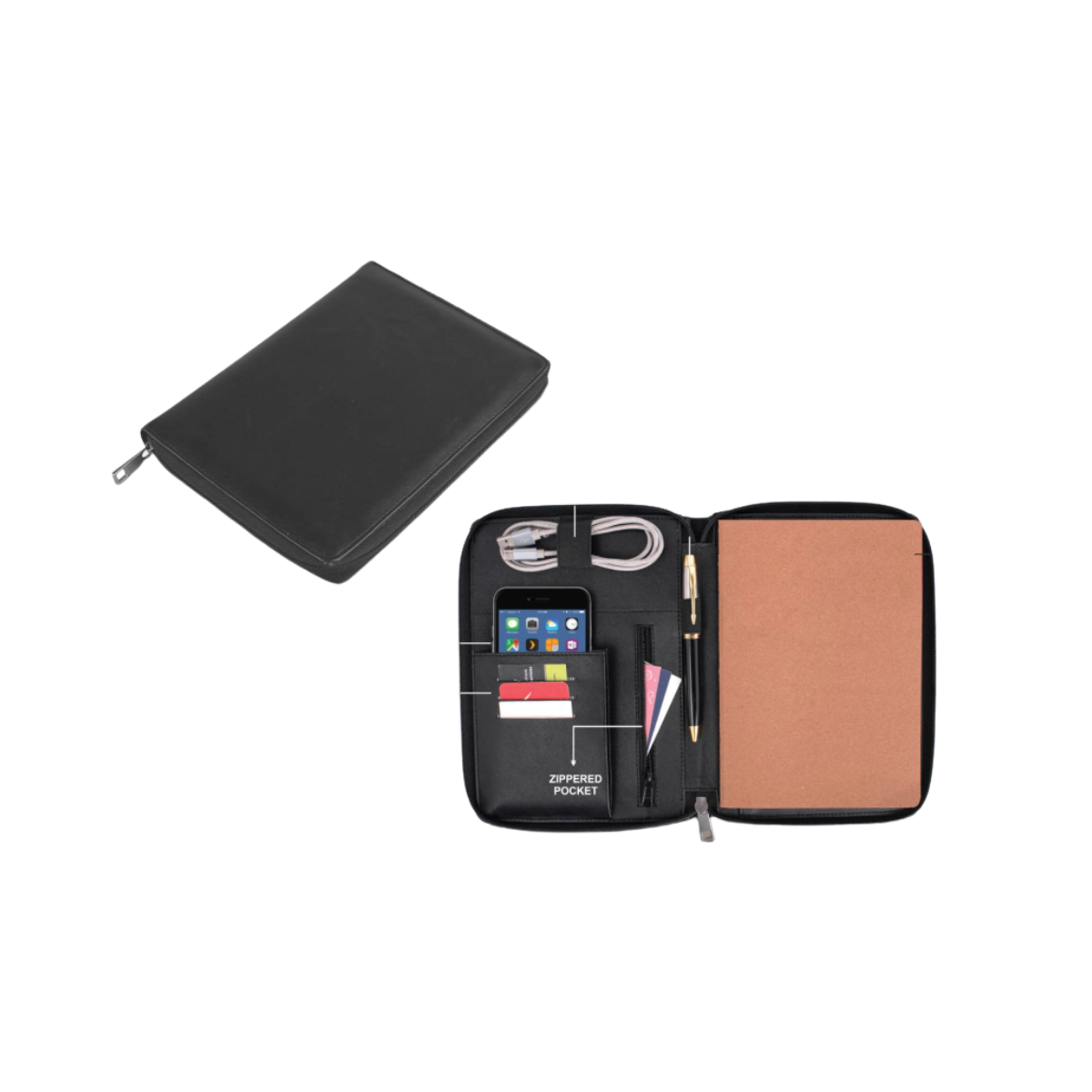 Omni Zippered Work folder with Notebook | Pockets for cards, Phone, Pen, Cables, Etc.