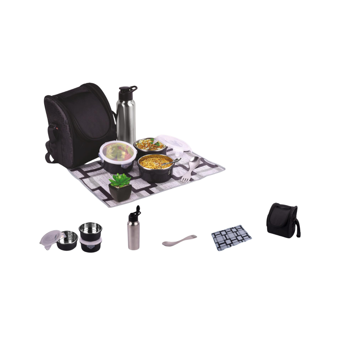 ✔ Includes 3 steel containers, bottle, fork-spoon, table mat, premium lunch bag