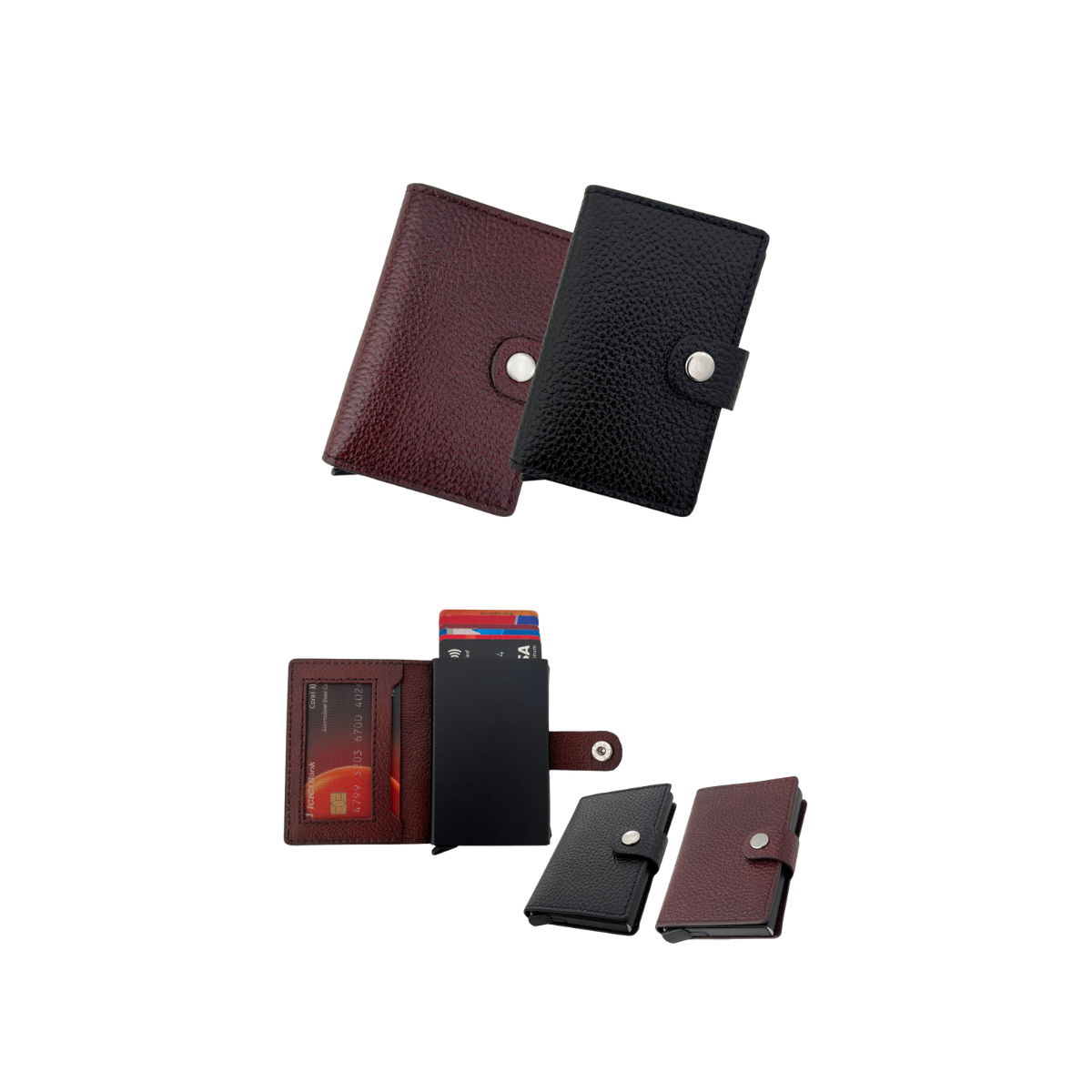 • Premium genuine leather RFID pop-up card case in black and brown.